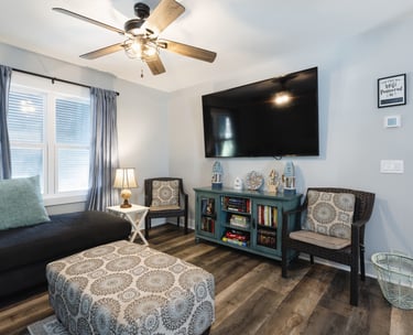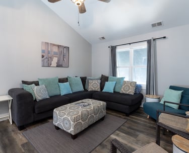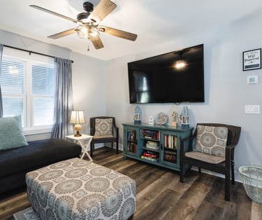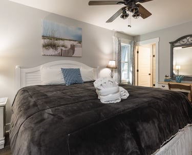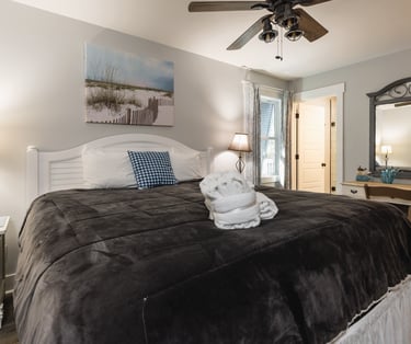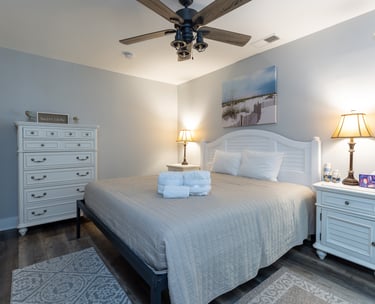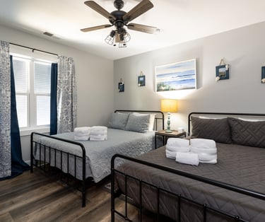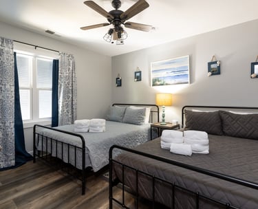 The primary bedroom features a King bed and ensuite bath, while the second bedroom includes two Queen beds. The third bedroom offers a twin bed with a pull-out twin trundle, and both guest rooms share a hallway bathroom. To make your beach days even easier, this rental includes four adult bicycles and four backpack beach chairs—free with your stay.